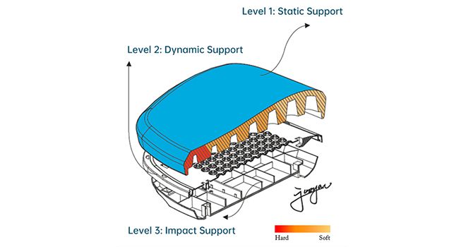 स्तर 1: शंक्वाकार छिद्रों के आकार का वितरण बैठने की स्थिति में विभिन्न कठोरता का समर्थन प्रदान करता है। स्तर 2: सहायक बिंदु मोड़ की स्थिति में अलग-अलग बफर प्रदान करता है। स्तर 3: अंतरिक्ष के बीच का अंतर गतिशील प्रभाव के तहत कुशन समर्थन प्रदान करता है।